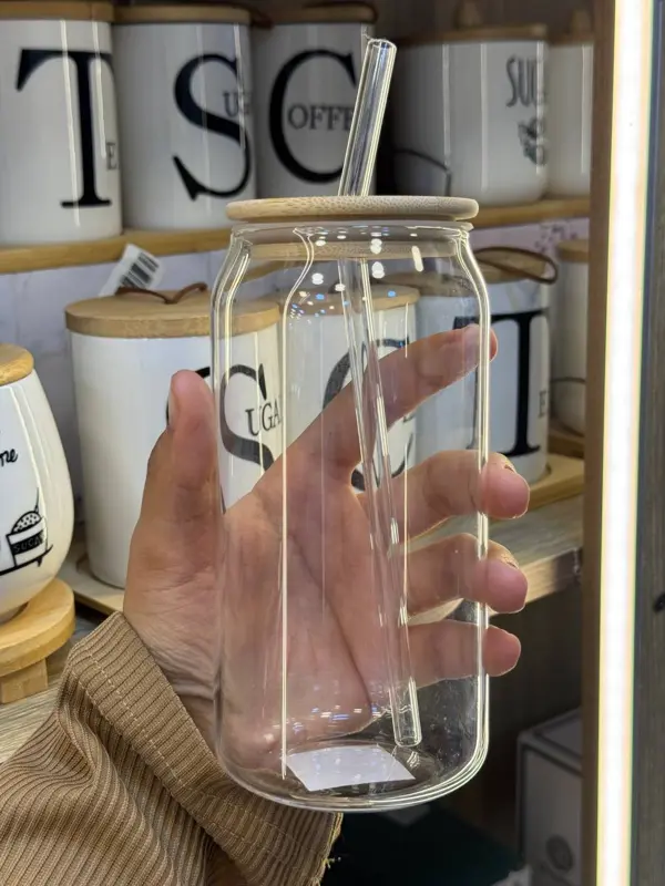 طقم 4 أكواب زجاجية شفافة، بسعة 500 مل، مع غطاء خشب طبيعي وشفاطة ستانلس قابلة لإعادة الاستخدام.