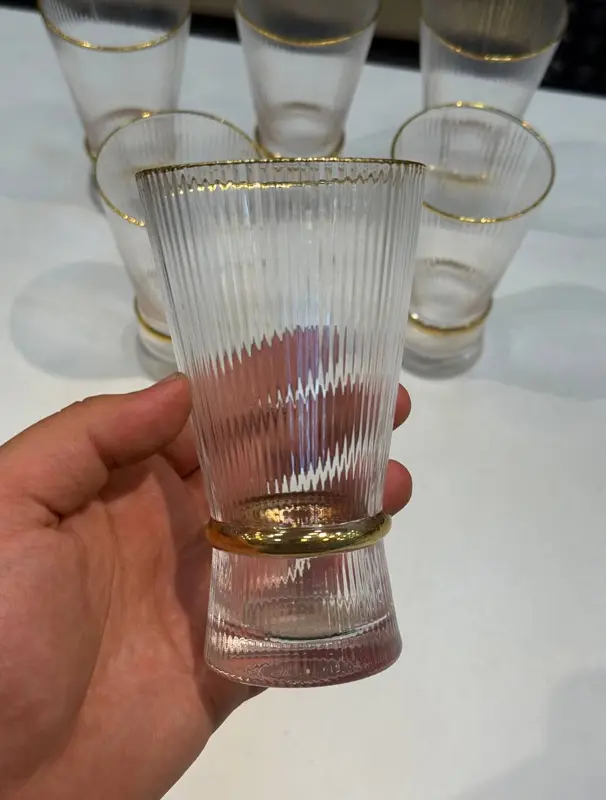 • تصميم فاخر: يتميز الأكواب بتصميم مضلع فريد، مزين بحواف وقواعد باللون الذهبي اللامع، مما يمنحها مظهراً راقياً ومميزاً.