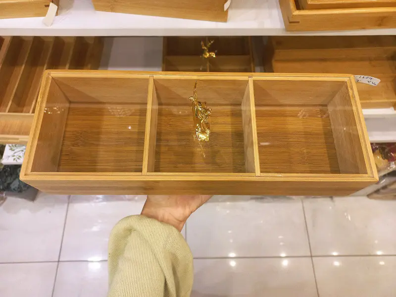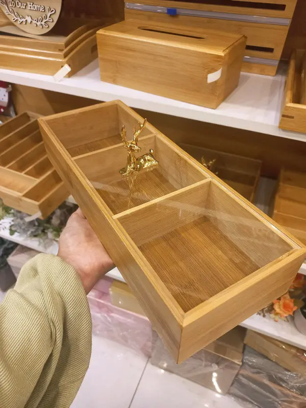 صُنع الطقم من خشب عالي الجودة يضمن متانته وقوته، ويحتوي على ثلاث خانات لتقديم أنواع مختلفة من المأكولات. أما الغطاء المصنوع من الأكريليك الشفاف فيحافظ على محتوياته، وتزينه يد على شكل غزالة تمنحه لمسة جمالية فريدة.