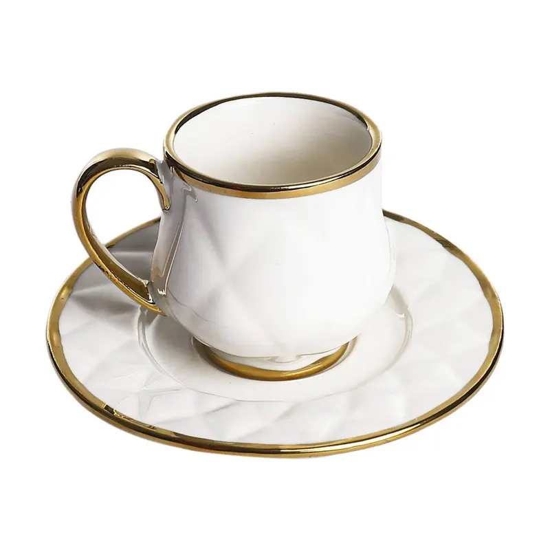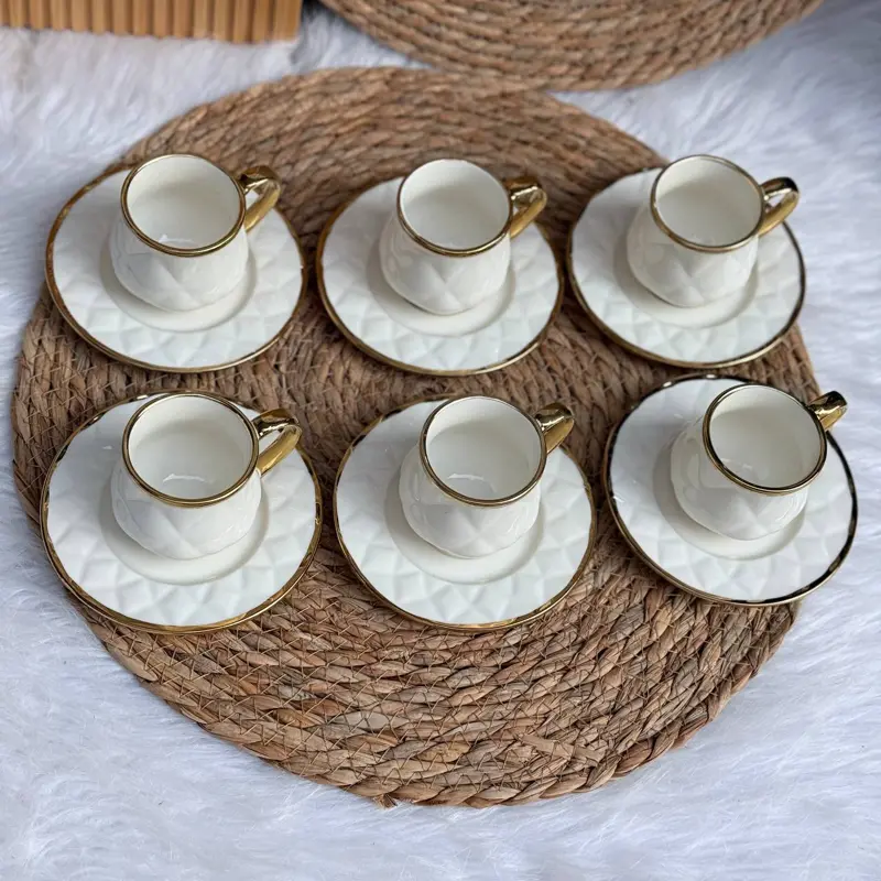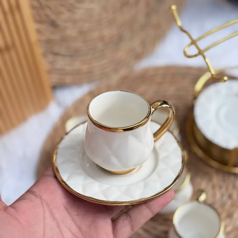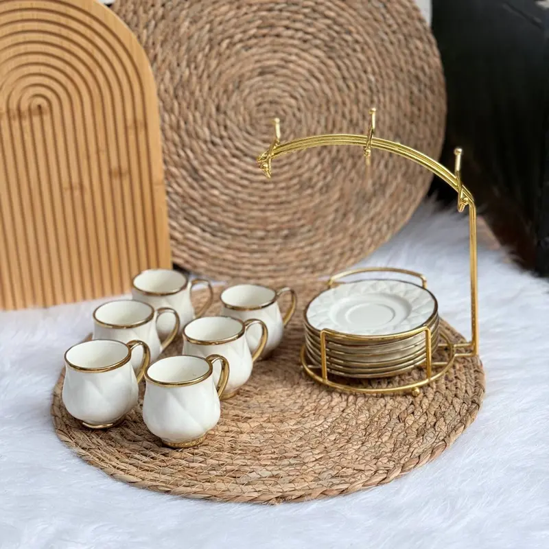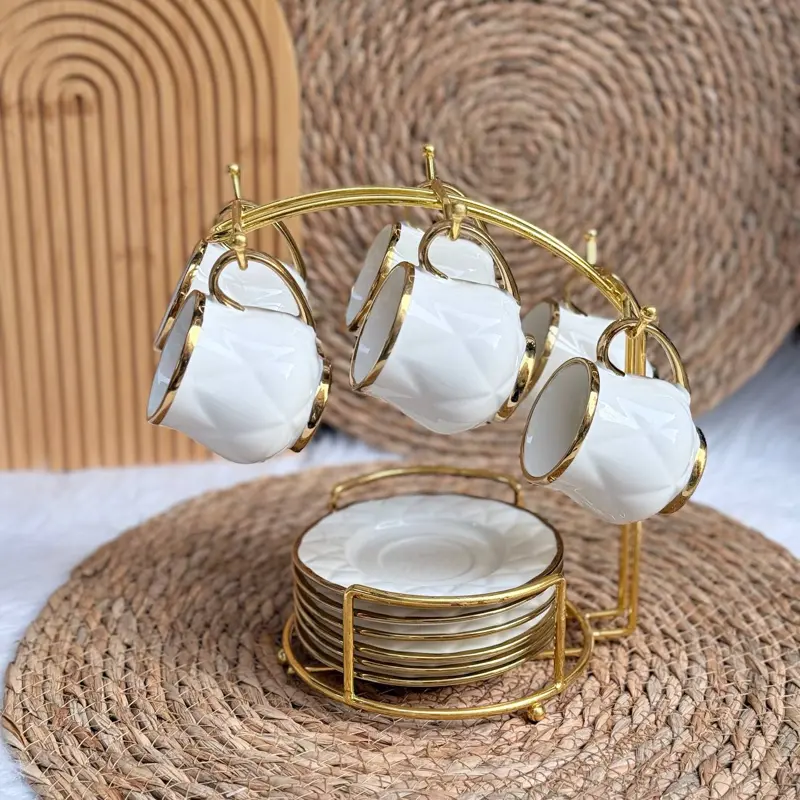 يتكون هذا الطقم من 12 قطعة، تشمل 6 فناجين و6 أطباق، جميعها مصنوعة من البورسلين المستورد عالي الجودة. يتميز بتصميمه الأنيق باللون الذهبي، حيث تأتي الفناجين بحافة ذهبية وحامل معدني بنفس اللون، مما يمنحه مظهرًا فاخرًا. الحامل عملي جدًا لتخزين الأطقم بشكل منظم وعرضها بشكل أنيق.