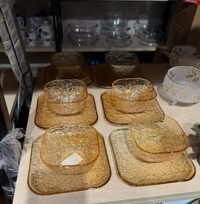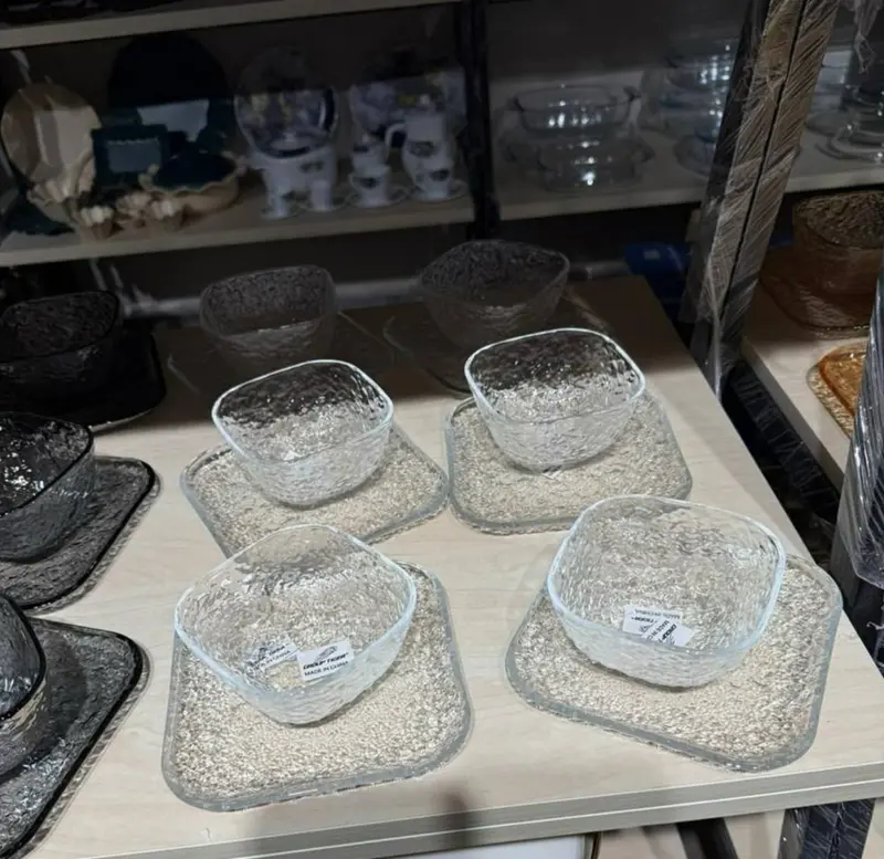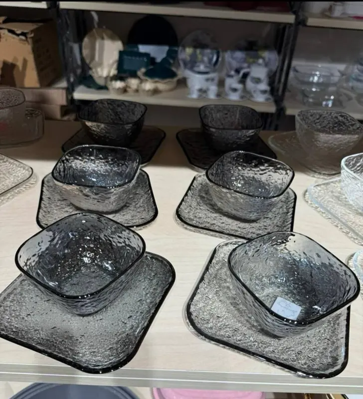 يتكون الطقم من 12 قطعة، تشمل 6 بولة و 6 أطباق متطابقة. يتاح بتصميمين فريدين: شفاف مضلع وعسلي مضلع، وكلاهما مصنوع من الزجاج عالي الجودة لضمان المتانة والأناقة.