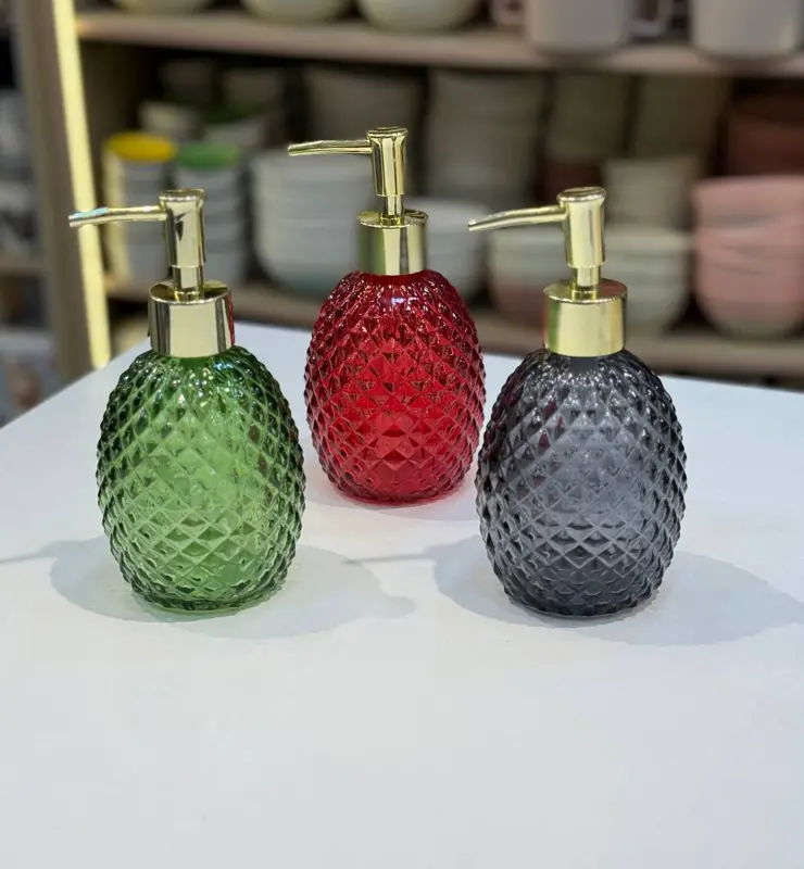 موزعات صابون زجاجية بتصميم أناناس عصري، متوفرة بثلاثة ألوان (أخضر، أحمر، وأسود رمادي) مع مضخات ذهبية. تُستخدم لتوزيع الصابون السائل وتضيف لمسة أنيقة لديكور الحمام أو المطبخ.350ملل
