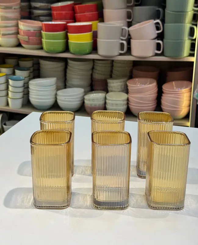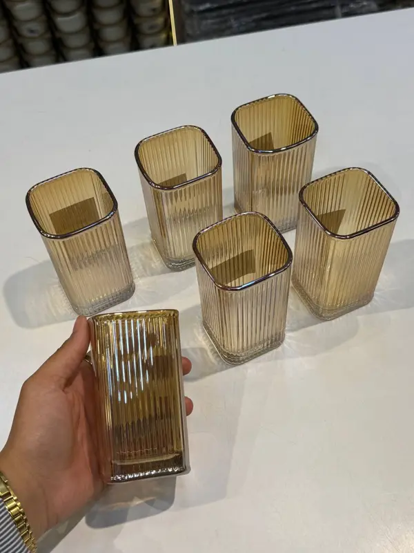 طقم شوب زجاجي أبيض مستورد، تصميم مربع منقرش فخم ولمسة كريستالية فريدة تضيف فخامة لأي جلسة. مثالي لتقديم المشروبات بأسلوب راقٍ.
