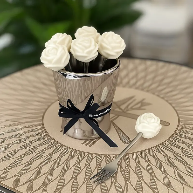 • شوك استانلس بتصميم وردة: الطقم مكوّن من شوك مصنوعة من استانلس ستيل عالي الجودة ومقاوم للصدأ، ويتميز بتصميم رأس وردة شيك جداً يضيف لمسة من الرقي والفخامة أثناء التقديم.