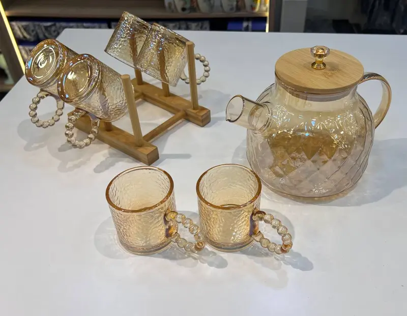 أبهري ضيوفكِ مع طقم الشاي الفاخر هذا! طقم البيركس الحراري المستورد يجمع بين متانة الزجاج المقاوم للحرارة وجمالية اللون العسلي المضلع، ليجعل كل جلسة شاي تجربة مميزة وراقية. يأتي الطقم كاملاً مع ستاند خشبي أنيق.