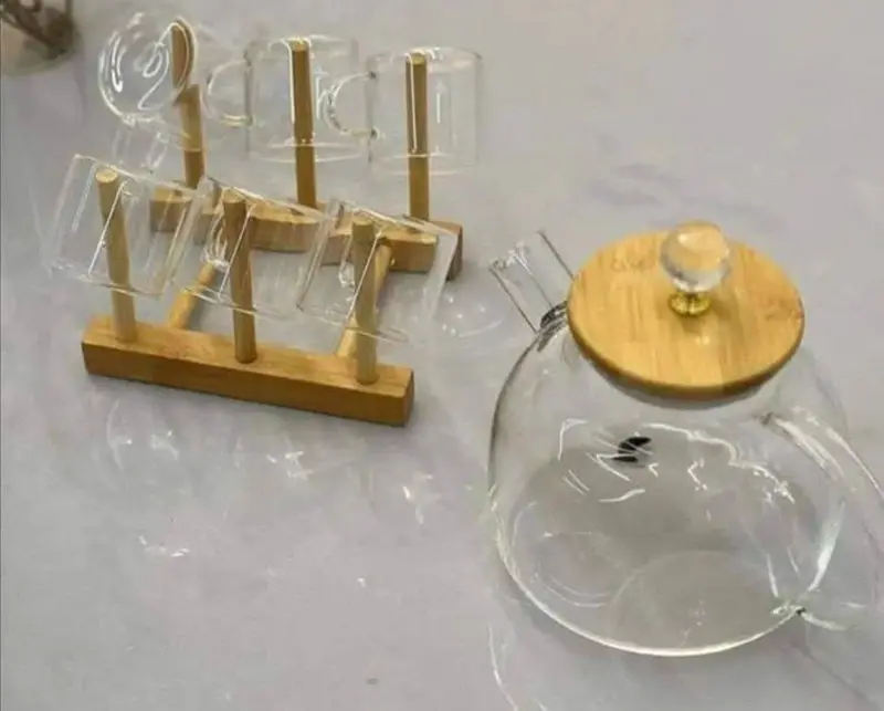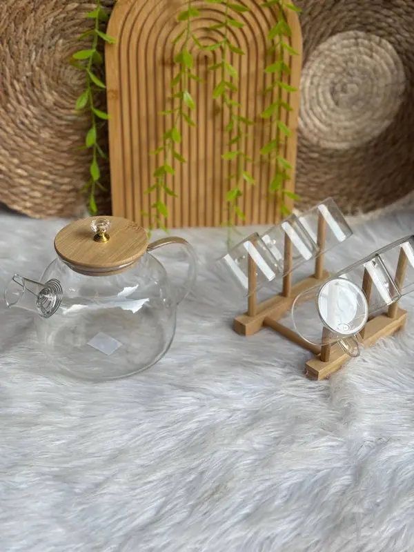 قطعة فاخرة تضفي الدفء والأناقة على لحظاتكِ. هذا الطقم الأنيق هو الإضافة المثالية لأي منزل، فهو يجمع بين الجمال والوظيفة ليمنحك تجربة شاي لا تُنسى. يتكون الطقم من براد زجاجي بسعة لتر، و6 أكواب، وحامل خشبي أنيق. يمكن استخدام البراد لتحضير الشاي أو الأعشاب على النار مباشرة باستخدام شياطة، كما يمكن استخدامه كدورق للمشروبات الباردة في الصيف. إنه منتج أصلي عالي الجودة يمنحكِ الأناقة والعملية في آن واحد.
