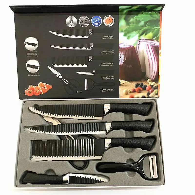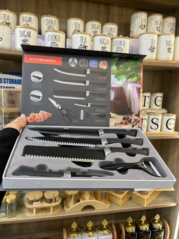 يتكون الطقم من 3 سكاكين، ساطور، مقشرة، ومقص. تأتي جميع القطع في علبة أنيقة، مما يجعله الخيار الأمثل لمن يبحثون عن الجمال والجودة في أدوات المطبخ.
