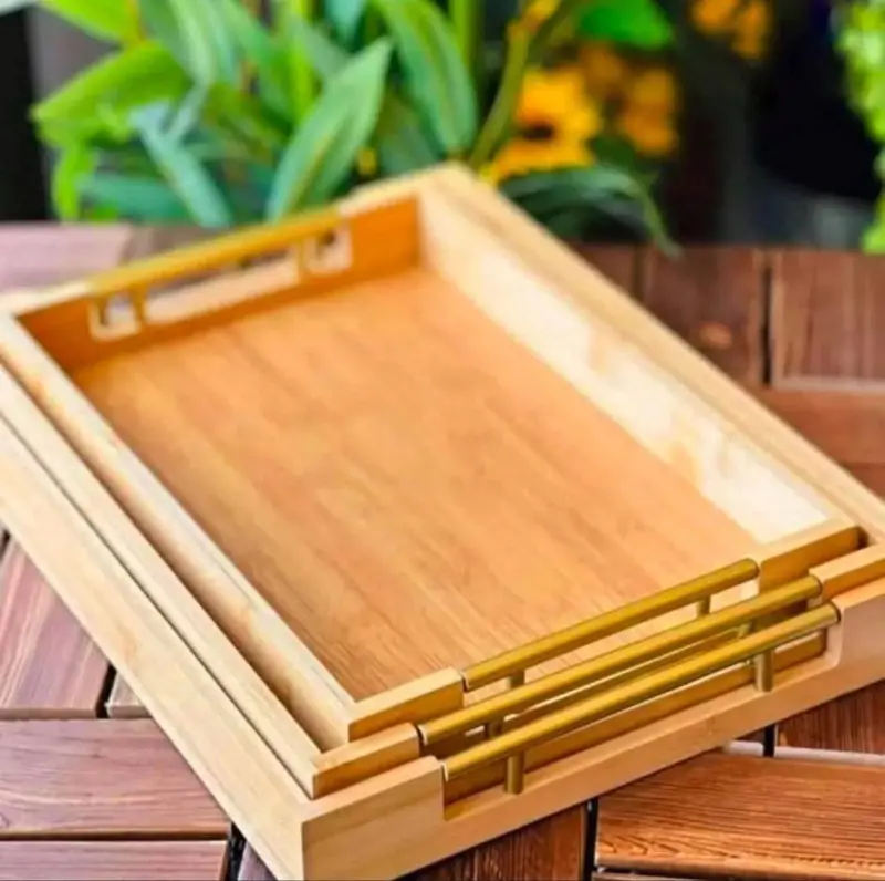 نقدم لكِ طقم صواني خشب البامبو، الذي يضفي لمسة من الدفء والأناقة على منزلك. تتميز الصواني بتصميمها الطبيعي، وتأتي بأيادي من الستيل الذهبي، مما يمنحها مظهرًا فاخرًا وعصريًا.