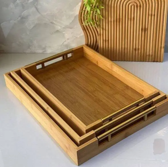 الطقم مستورد، ومصنوع من خشب البامبو، مما يجعله متينًا ويدوم طويلاً. الصواني تأتي بثلاثة مقاسات مختلفة: 44 × 33 سم، 41 × 30 سم، و 26 × 38 سم. هذه المقاسات الأكبر من المعتاد توفر مساحة كافية لتقديم الطعام والمشروبات بشكل مريح وأنيق.