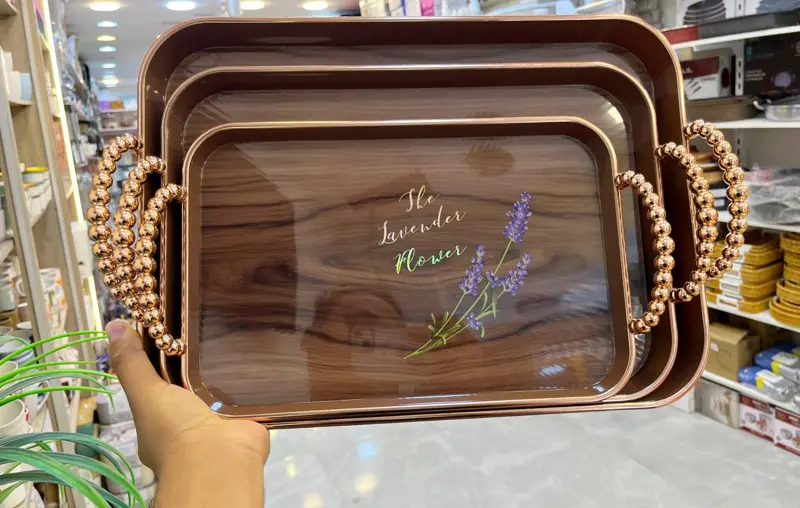 حوّلي أي ضيافة بسيطة إلى مناسبة راقية مع هذا الطقم المميز! طقم الصواني الميلامين المستطيل هذا يجمع بين شكل الخشب الفاخر ومتانة الميلامين، مع إضافة عصرية من مقابض "بابلز" الأنيقة. طقم شيك جداً سيجعل سفرتك أشيك بكثير!