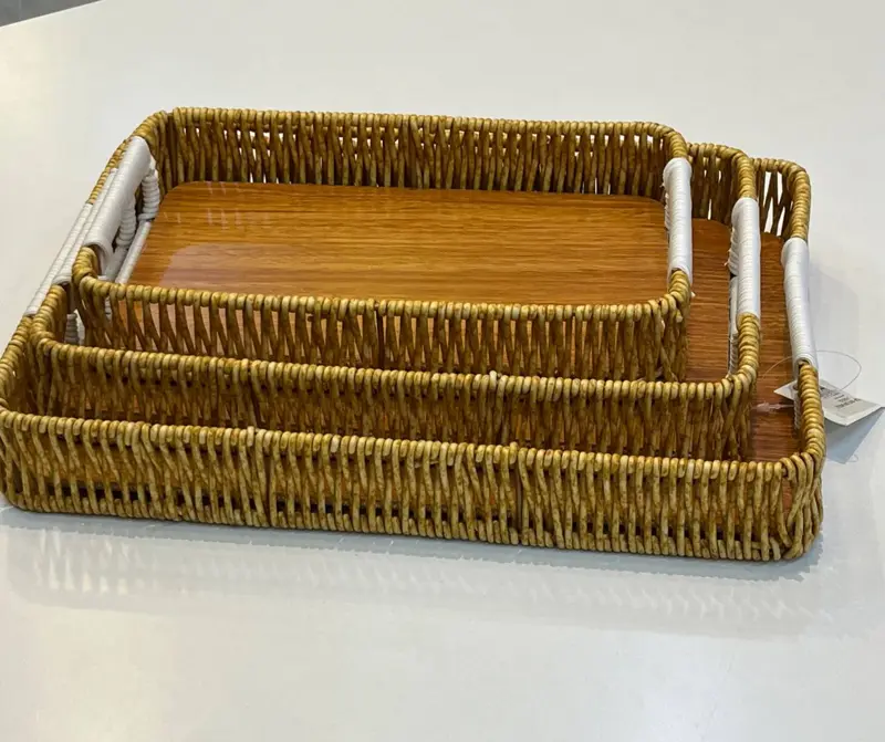 امنحي ضيافتكِ لمسة دافئة وعصرية مع طقم الصواني المستطيلة المنسوجة! هذا الطقم المكون من ثلاث قطع يجمع بين شكل الخيزران الطبيعي والوظيفة العملية، ليكون رفيقكِ المثالي في التقديم والتنظيم.