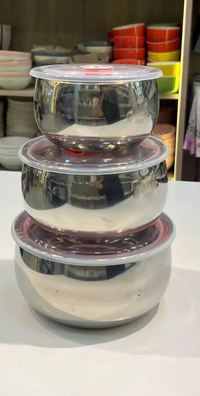 استمتع بحفظ طعامك طازجًا بأناقة مع هذا الطقم المكون من ثلاث حافظات طعام من الستانلس ستيل. بتصميم عصري وبسيط، يأتي الطقم بأحجام مختلفة (12 سم، 14 سم، و16 سم) لتلبية جميع احتياجاتك.