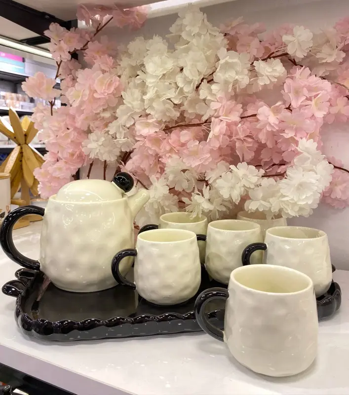 • مجموعة متكاملة وفخمة: الطقم يتكون من 6 أكواب عصرية، ودورق (كاراڤ) أنيق، بالإضافة إلى صينية تقديم بورسلين كبيرة، جميعها بتناسق يخطف العين.