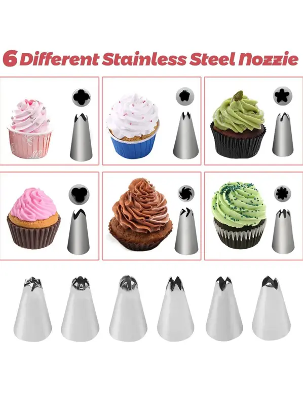 • 8 بلابل بأشكال مختلفة: يضم 8 بلابل (فوهات تزيين) بأشكال متنوعة لعمل رسومات وأنماط مختلفة من الورود والزخارف.