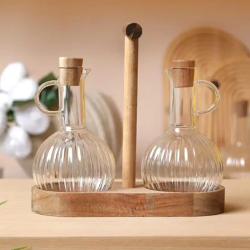 تقديم أنيق لمائدتك. أضيفي لمسة من الجمال الطبيعي والأناقة إلى مطبخك مع هذا الطقم المميز. يتكون الطقم من زجاجتين من زجا…