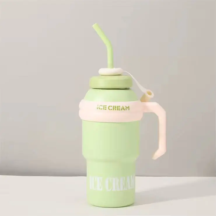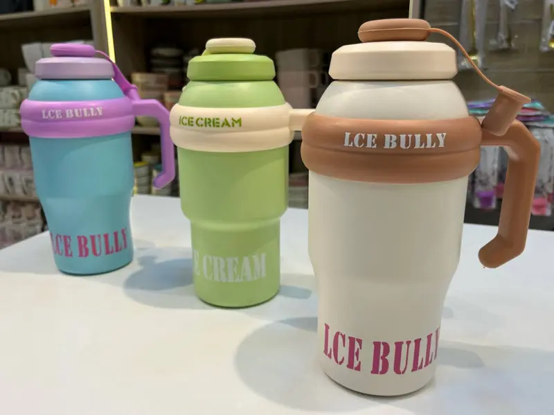 ترمس أنيق بسعة 1200 مللي، مزود بيد سيليكون مريحة وتصميم "Ice Cream" بألوان زاهية (أزرق ووردي). يتميز بسهولة الاستخدام وأنبوب شرب قابل للإزالة، مما يجعله خيارًا عمليًا وجذابًا للشرب اليومي