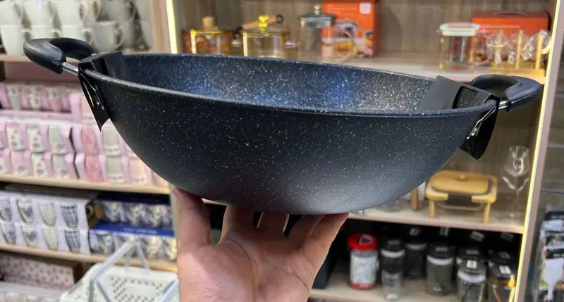 • مقاس 34 سم عميق: يتميز بـ مقاسه الكبير (34 سم) وشكله العميق (غويط)، مما يجعله مثالياً لطهي كميات كبيرة من الطعام دفعة واحدة أو لعمل أطباق التشويح والقلي الاحترافية.