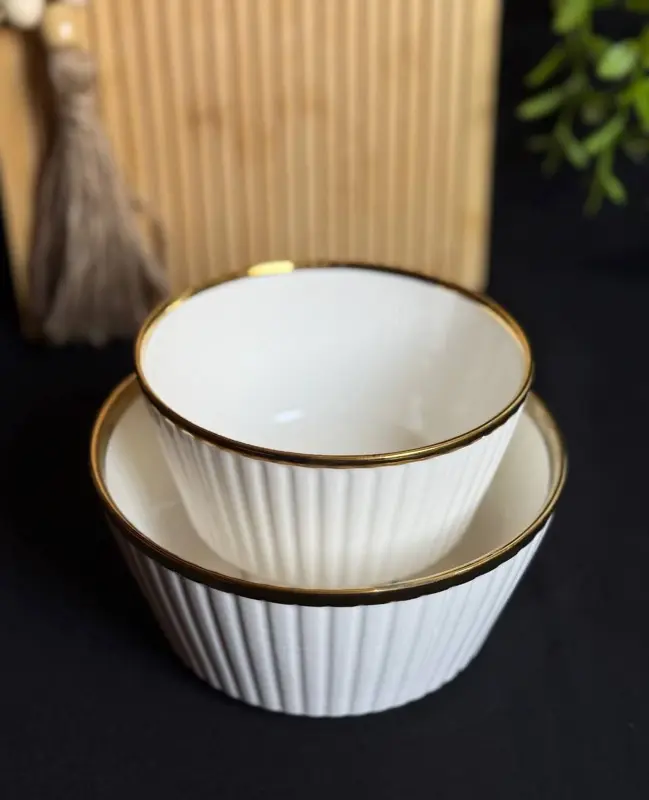 لمسة من الفخامة الأنيقة لمائدتك. هذه البولة المستوردة تجمع بين الجمال والعملية، حيث تتميز بتصميمها المضلع الأنيق الذي يضفي لمسة من الشياكة على التقديم. البولة مصنوعة من البورسلين الحراري عالي الجودة، مما يجعلها آمنة للاستخدام في الميكروويف وغسالة الأطباق. متوفرة بلون أبيض مميز مع حواف ذهبية، وتأتي بمقاسين مختلفين: الصغير بقطر 12 سم وارتفاع 7 سم، والكبير بقطر 16 سم وارتفاع 8 سم، لتناسب جميع استخداماتكِ.
