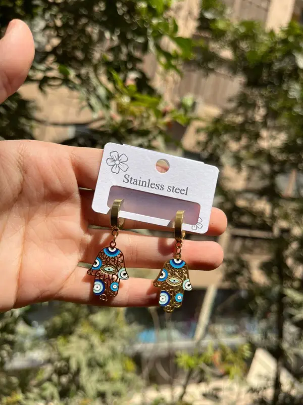 يتميز هذا الحلق بتصميمه الفريد على شكل "يد فاطمة" (الخمسة)، وهو رمز تقليدي للحماية والأمان. تتزين اليد بالعديد من العيون الزرقاء والزخارف الهندسية الدقيقة، التي تمنح القطعة طابعًا شرقيًا أصيلًا وجمالًا لا يقاوم.