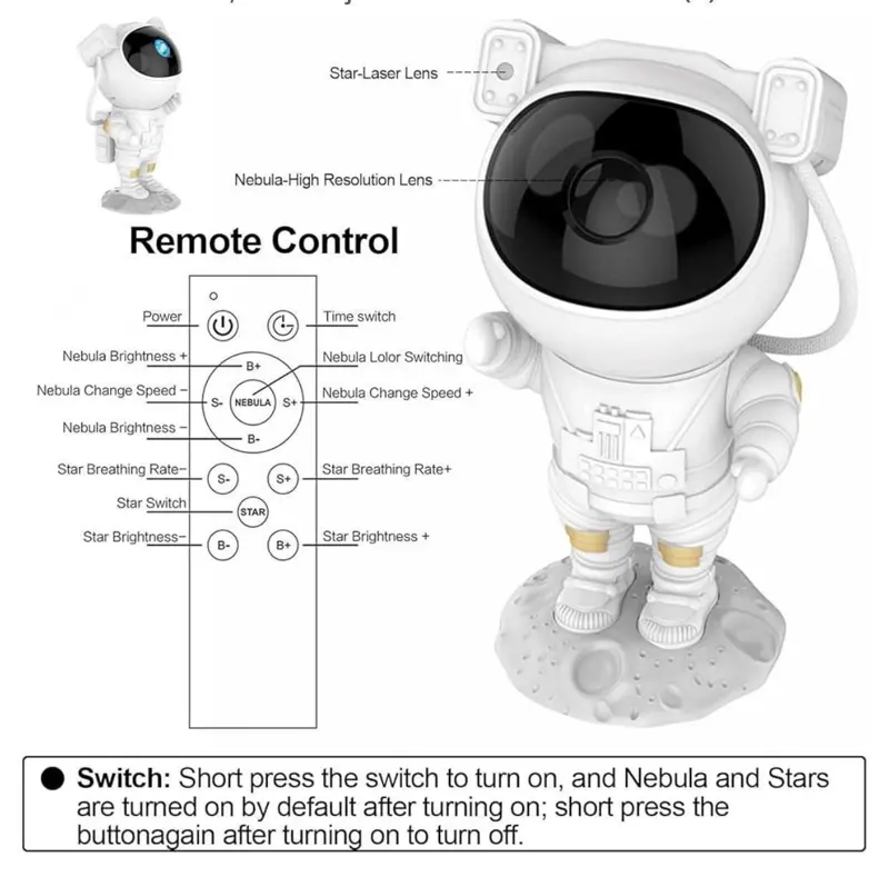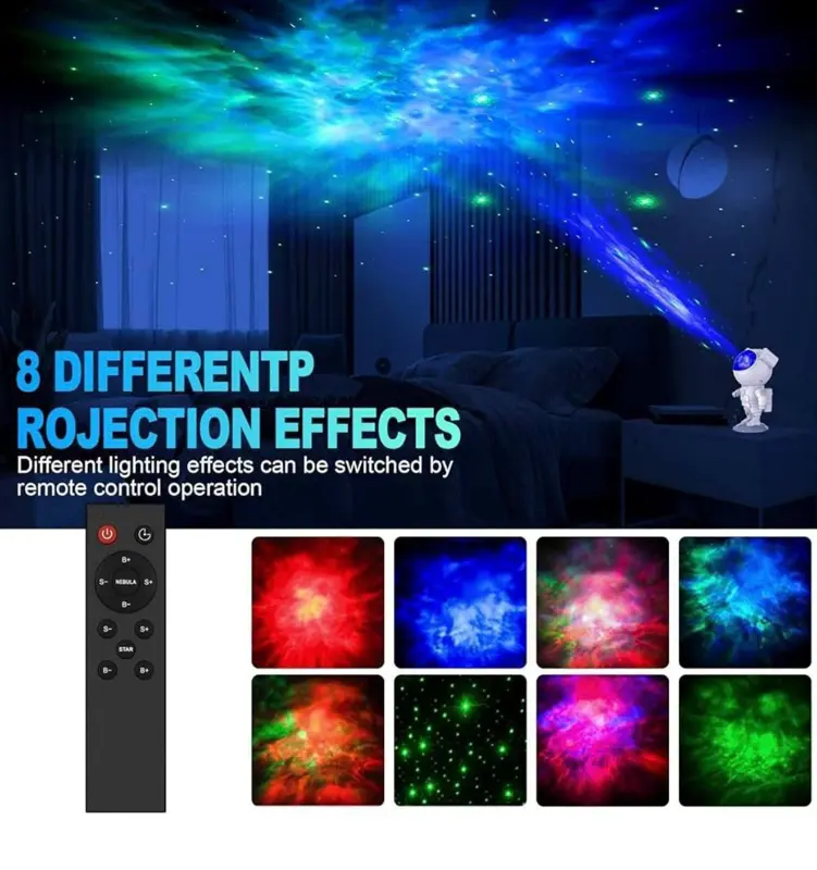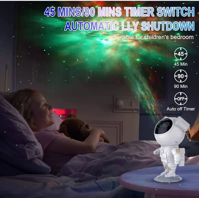 جهاز STARRY SKY PROJECTOR: انطلق في رحلة إلى الفضاء من راحة غرفتك. هذا الجهاز المبتكر يجمع بين الإضاءة الساحرة والصوت المريح في تصميم لرجل فضاء. يعرض إضاءة ملونة ونقاط ليزر خضراء تخلق منظرًا مشابهًا لسماء مليئة بالنجوم، وتتسع الإضاءة لتصل إلى مسافة 500 متر. مزود بريموت كنترول للتحكم في ألوان وأنماط الإضاءة، كما يمكن استخدامه كسماعة صوت لتشغيل الأغاني عبر البلوتوث أو للاستمتاع بالمؤثرات الصوتية الطبيعية المدمجة. أبعاده المثالية (قطر القاعدة 12 سم، الارتفاع 22 سم) تجعله إضافة مثالية لأي غرفة.