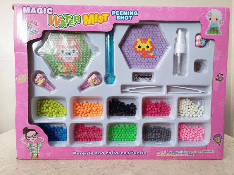 تحتوي المجموعة على خرز مائي بألوان متنوعة، وعلبة رشاش ماء، وقوالب مختلفة لعمل الأشكال. الخرز مصنوع من مواد آمنة وغير سامة، ومصمم ليلتصق عند رش الماء عليه. هذه اللعبة تُعد وسيلة رائعة لقضاء وقت ممتع ومفيد.