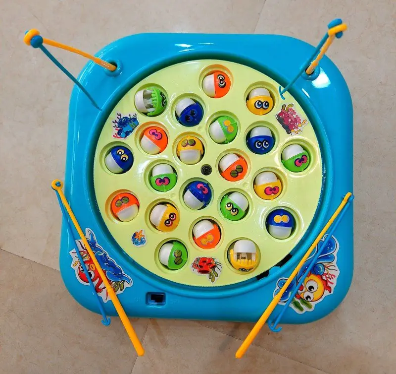تتكون اللعبة من حوض بلاستيكي صغير يمثل بركة، ومجموعة من الأسماك الملونة الصغيرة التي تحتوي على قطع معدنية. تأتي مع سنارة صيد بقطعة مغناطيسية في نهايتها، مما يجعل عملية الصيد سهلة ومرحة. جميع الأجزاء مصنوعة من مواد آمنة ومتينة لضمان سلامة طفلكم.