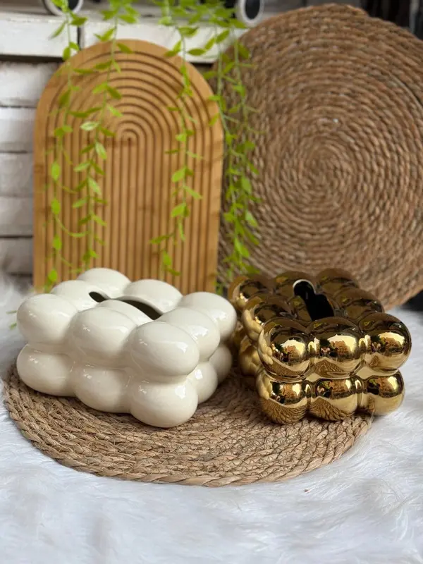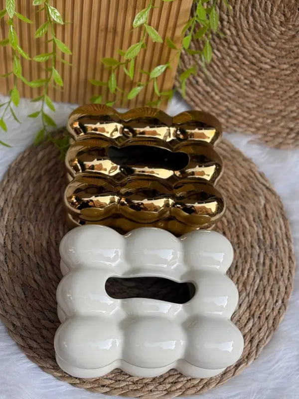 نقدم لكِ علبة المناديل المصنوعة من البورسلين، والتي تتميز بتصميمها الفريد على شكل بابلز. العلبة أنيقة وعصرية، ومصنوعة من مواد عالية الجودة. متاحة باللونين الأبيض والذهبي، مما يمنحكِ خيارات لتناسب ديكور منزلك. هذا المنتج مستورد ومصمم بجودة عالية، وهو الخيار الأمثل لمن يبحثون عن الأناقة في أدوات المنزل.