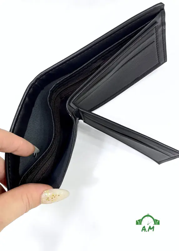 • تصميم فاخر: تتميز المحفظة بتصميم بسيط وأنيق باللون الأسود مع شعار العلامة التجارية، مما يضفي عليها طابعًا من الرقي.