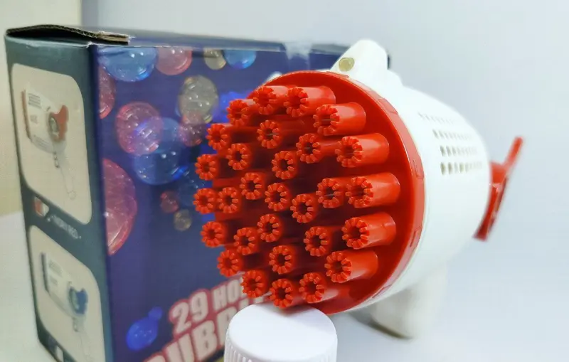 صُنع المسدس من بلاستيك آمن وعالي الجودة يضمن متانته ومقاومته للعب المتكرر. طريقة استخدامه سهلة للغاية؛ ما عليك سوى غمس فوهة المسدس في سائل الفقاعات الموجود في الوعاء المرفق، ثم الضغط على الزناد لتقوم الـ29 فتحة بإطلاق سيل من الفقاعات الملونة في آن واحد.