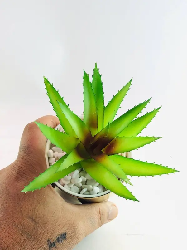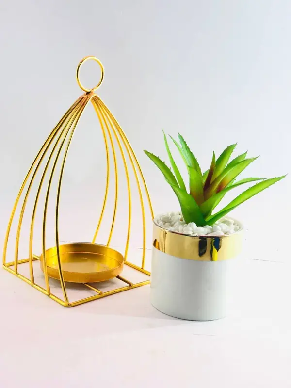 يتكون المنتج من نبات بلاستيكي واقعي بجودة عالية، يتميز بأوراق زاهية لا تبهت. يوضع النبات في وعاء من الخزف الفاخر، ويستقر على حامل معدني ذهبي مصقول يضيف للقطعة ثباتًا لا مثيل له. هذه الخامات عالية الجودة تضمن متانة وقوة المنتج، ليتحمل الاستخدام اليومي ويظل أنيقًا لسنوات طويلة دون أن يبهت لونه. لا يتطلب هذا النبات أي صيانة أو رعاية؛ فهو لا يحتاج إلى ماء أو ضوء شمس. يبلغ ارتفاعه الإجمالي ١٥ سم، مما يجعله إضافة مثالية للمكاتب، الرفوف، الطاولات الجانبية، أو أي ركن ترغب في تزيينه.