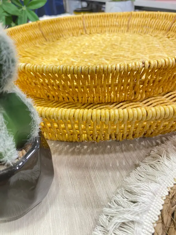 أضيفي لمسة بوهيمية عصرية وفريدة لديكور مائدتكِ! صينية الخوص الهاند ميد هذه هي قطعة فنية بتفصيلة شيك، مثالية للتقديم أو للتنظيم الأنيق.
