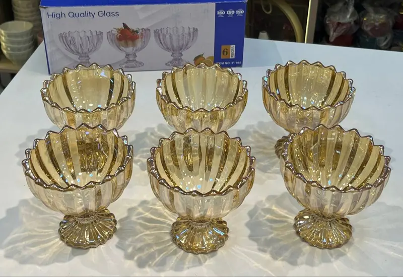 نقدم لكِ طقم الكاسات والآيس كريم، الذي يضفي لمسة من الأناقة والفخامة على مائدتك. يتميز الطقم بتصميمه المضلع ولونه الذهبي، مما يجعله قطعة فريدة ومميزة. الطقم مكون من 6 قطع، مما يجعله مثاليًا للضيوف أو العائلة.