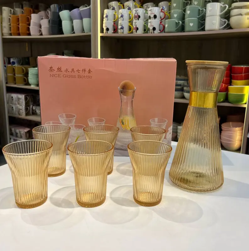 جدد مائدة طعامك مع طقم القارورة العصري باللونين الشفاف والعسلي الجذاب. يتكون الطقم من قارورة بسعة 1000 مل وستة أكواب بسعة 250 مل، مثالي لتقديم المياه والعصائر بطريقة أنيقة ومميزة.