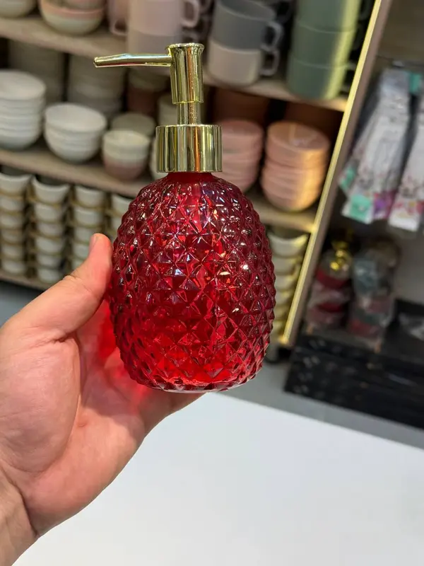 موزعات صابون زجاجية بتصميم أناناس عصري، متوفرة بثلاثة ألوان (أخضر، أحمر، وأسود رمادي) مع مضخات ذهبية. تُستخدم لتوزيع الصابون السائل وتضيف لمسة أنيقة لديكور الحمام أو المطبخ.350ملل