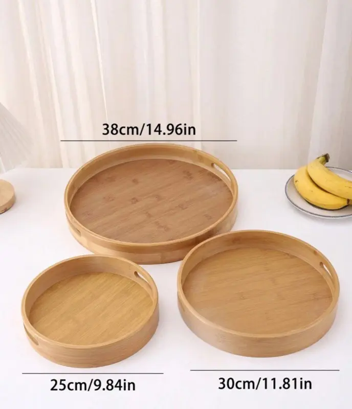 صُنعت هذه الصواني من خشب البامبو المستورد عالي الجودة، المعروف بمتانته ومقاومته للماء. يتكون الطقم من ثلاث صواني مختلفة الأحجام، مما يجعله عمليًا جدًا للاستخدام في جميع المناسبات. يمنحها شكلها الأنيق مظهرًا رائعًا يناسب أي ديكور.