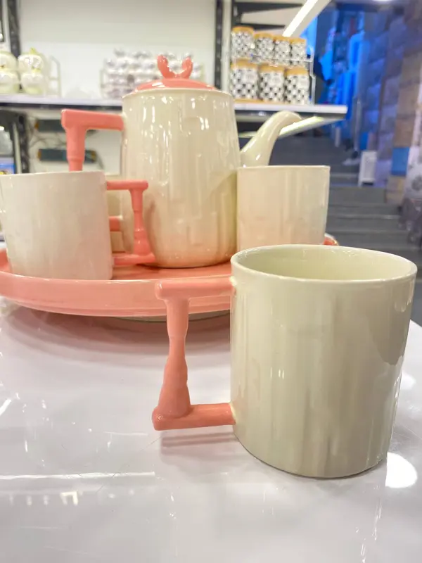 • تصميم عملي وفاخر: شكل الكوب والدورق انسيابي وراقي، مما يجعله إضافة مميزة للنيش وللاستخدام العملي الفاخر.