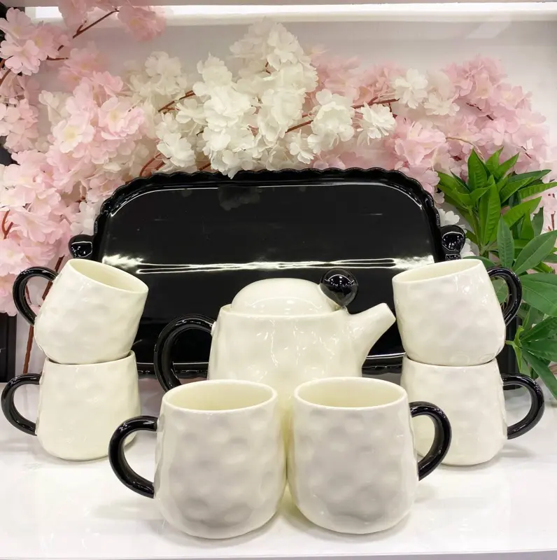 • مجموعة متكاملة وفخمة: الطقم يتكون من 6 أكواب عصرية، ودورق (كاراڤ) أنيق، بالإضافة إلى صينية تقديم بورسلين كبيرة، جميعها بتناسق يخطف العين.