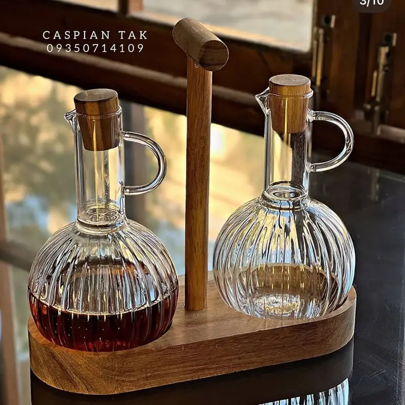 تقديم أنيق لمائدتك. أضيفي لمسة من الجمال الطبيعي والأناقة إلى مطبخك مع هذا الطقم المميز. يتكون الطقم من زجاجتين من زجا…